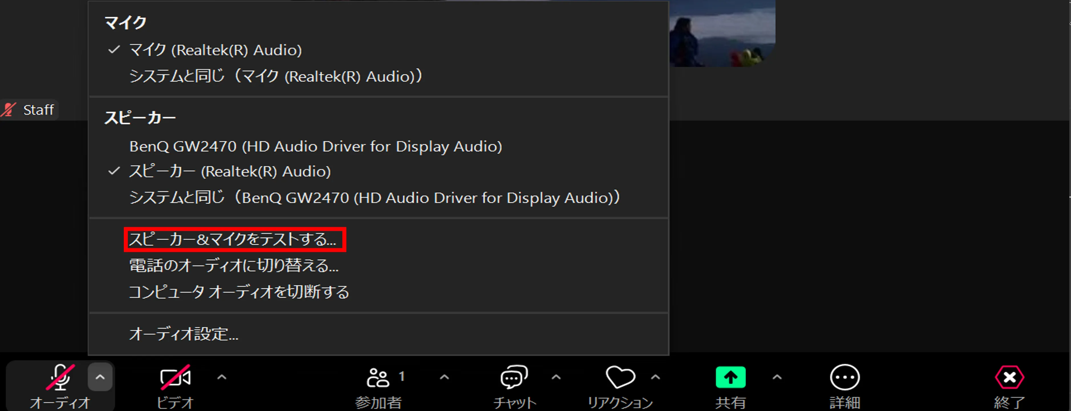 「参加時にコンピュータでオーディオに自動で接続する」の設定がオフになっている場合,ミーティングに参加した際に表示されるウィンドウの「スピーカーとマイクをテスト」を押してください.